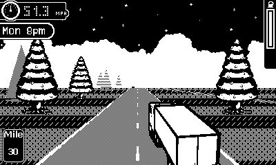 It’s a game that demands your full attention, just like real trucking. A downgrade on the road can make you speed up without even touching the gas (your speed limit for the most part is 50 mph, and seeing an upcoming corner while you’re going way too fast down a steep hill will teach you fear), and sometimes a car in front of you is only going 30 mph so you have to pass it without running into everyone else on the road. The thing that can really make or break you, though, just like in Top Gun on the NES, is the very final part. In Top Gun, it was landing on the aircraft carrier at the end of your mission. Here, it’s backing your trailer perfectly into a loading garage. There are time limits for your deliveries, but for the most part they’re more than gracious as long as you don’t get lost. The time slows to a crawl once you’re off the main road to encourage exploring and safe parking. But let me say this: backing a trailer into a garage is one of the most difficult things you will ever do on the Playdate. You need to center yourself emotionally before you can center your trailer physically. With no real time limit for parking, it’s just you vs. you. You can do it! But not at first, absolutely not. You’ll sometimes look a bit like Austin Powers when he tried to turn his vehicle around in that little hallway.
