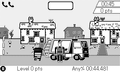In this game, you drive a garbage truck. You drive left and right along a street that felt a little Paperboy-inspired, pick up garbage bins that are randomly left out on the curb in front of an ever-increasing number of houses, then drive it to the left (or the right, once you get to the harder recycling levels) to dump it. It uses a combination of the d-pad, buttons, and crank to lift/dump, so you’ll always be doing something.